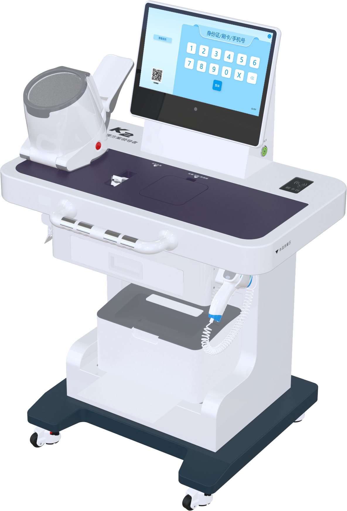 標配檢測功能:體溫、人體脂肪成分(脂肪含量、基礎代謝、水分含量、體脂肪量、體水分量、肌肉率、肌肉量、骨量、內臟脂肪等級、體型判斷等)、血壓、脈率、血氧、血流灌注指數、心電(6-12導)、腰圍、臀圍、腰臀比、血糖、尿酸、膽固醇。可擴展功能:身高體重、骨密度、肺功能、尿液分析...產品特點安裝簡單:高度集成一體化設計,安裝部署理簡單,幾分鐘即可通電使用; 移動方便:安裝移動輪,移動方便; 身份識別:二